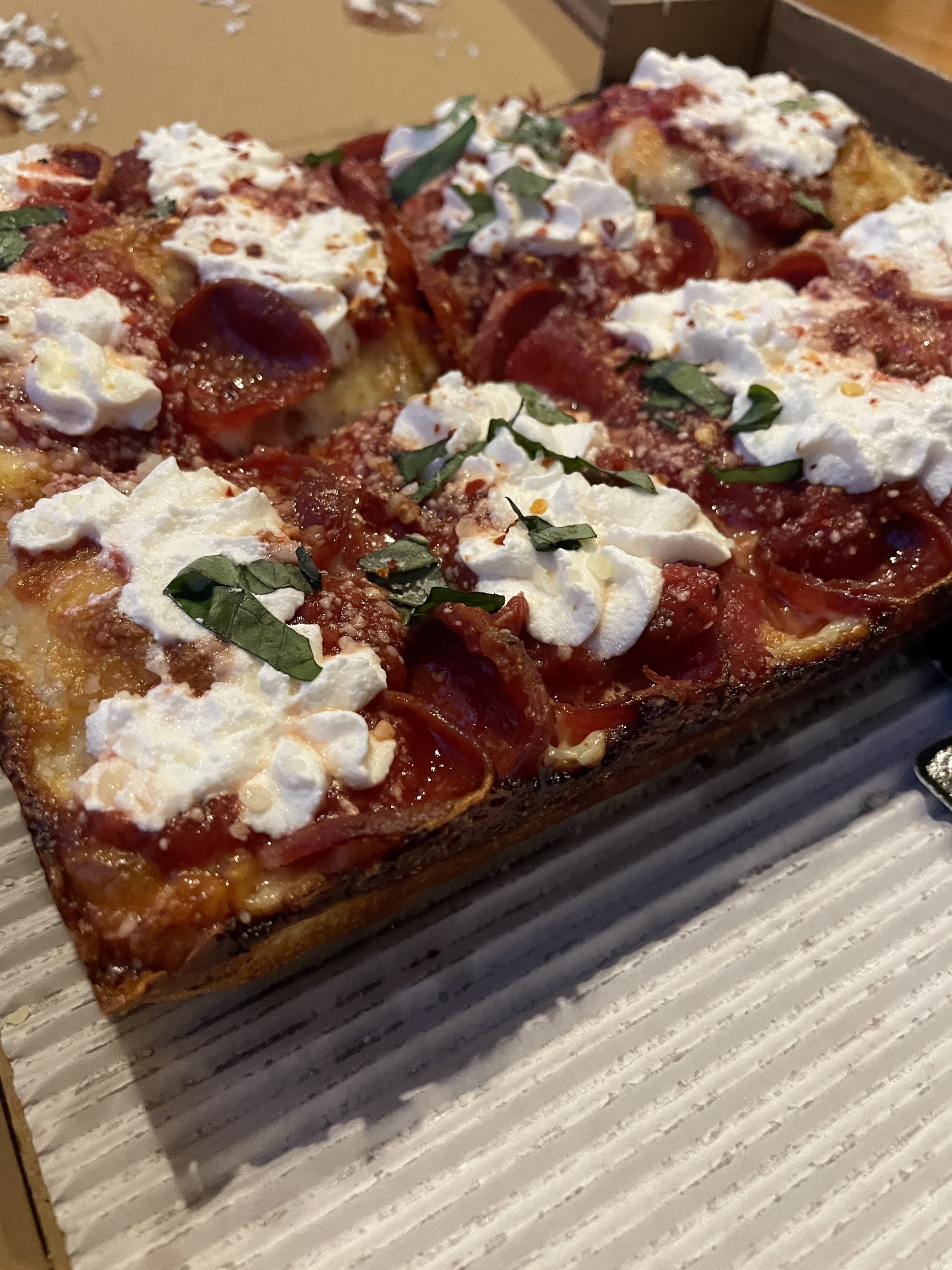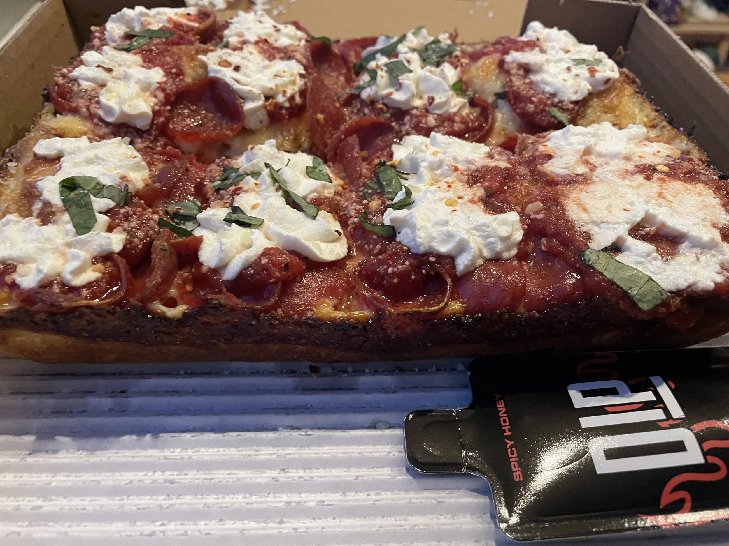 As the first Pizza place I had to come up with a way to judge, so i started to figure out what I should be using to judge. about five minutes in I ended up giving up on this and said eh I’ll figure it out as I go. So I ordered a pizza from Palazzo Di Pizza and tried to get a unique pizza. What I ordered came with Pepperoni, ricotta, red pepper flakes, and hot honey. The Detroit style pizza had a pronounced cheese crust that executed flavor in a way that you may think it was the star of the show but the slightly sweet sauce was very much the component that kicked this dish off. The spice of the honey and the red pepper flakes made it a nice offset of flavors on the palate. The Pepperoni was very telling that they had tried a few Pepperonis before deciding on this one to top their pies, the ricotta worked its way into each bite as a creamy addition to the cheese already on the pizza. There wasn’t too much to say about the dough but what stuck out was crispy and flavorful.